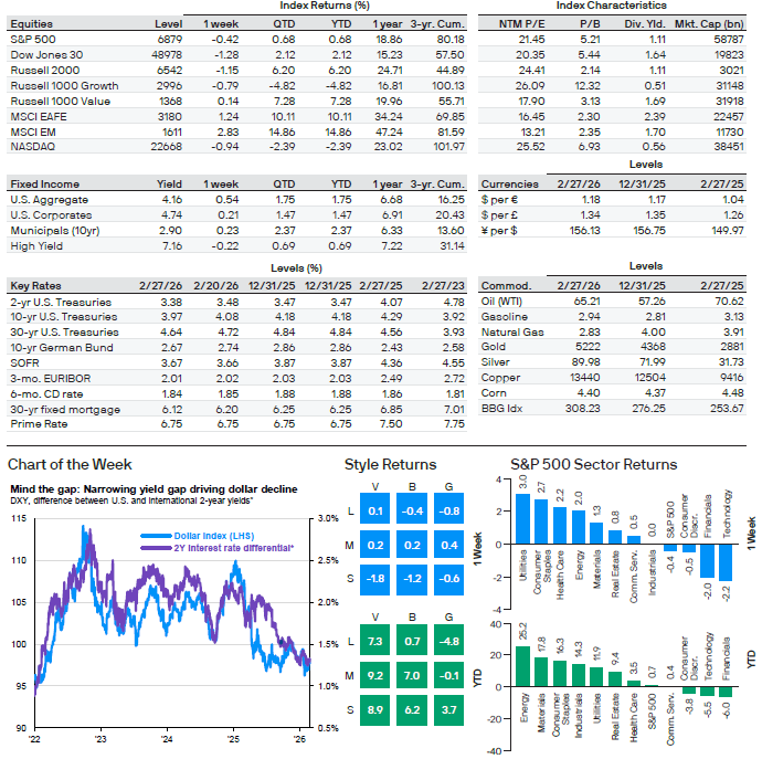 *Interest rate differential is the difference between the 2-year U.S. Treasury yield and a basket of the 2-year yields of each major trading partner (Australia, Canada, eurozone, Japan, Sweden, Switzerland and UK). Weights in the basket are calculated using the 2-year average of total government bonds outstanding in each region. Data show history from Jan 1, 2022 to Feb 27, 2026.