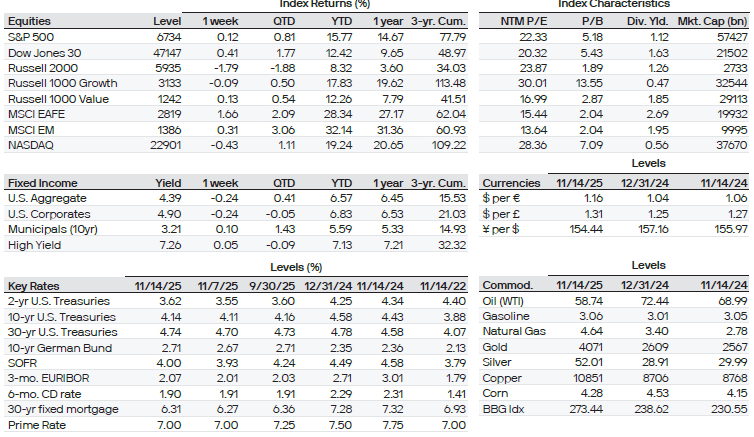 Markets largely looked through the shutdown, much as they have in past episodes. But just as the deal removed one overhang, new risks emerged, with uncertainty around the Fed’s December cut contributing to the late-week sell-off. Valuations still remain stretched, and more risks sit on the horizon. The current funding deal runs only through January 30, and looming IEEPA tariff rulings could introduce fresh volatility. Against this backdrop, investors may want to consider further diversifying their portfolios and adding downside protection should economic turbulence begin to catch up with markets.